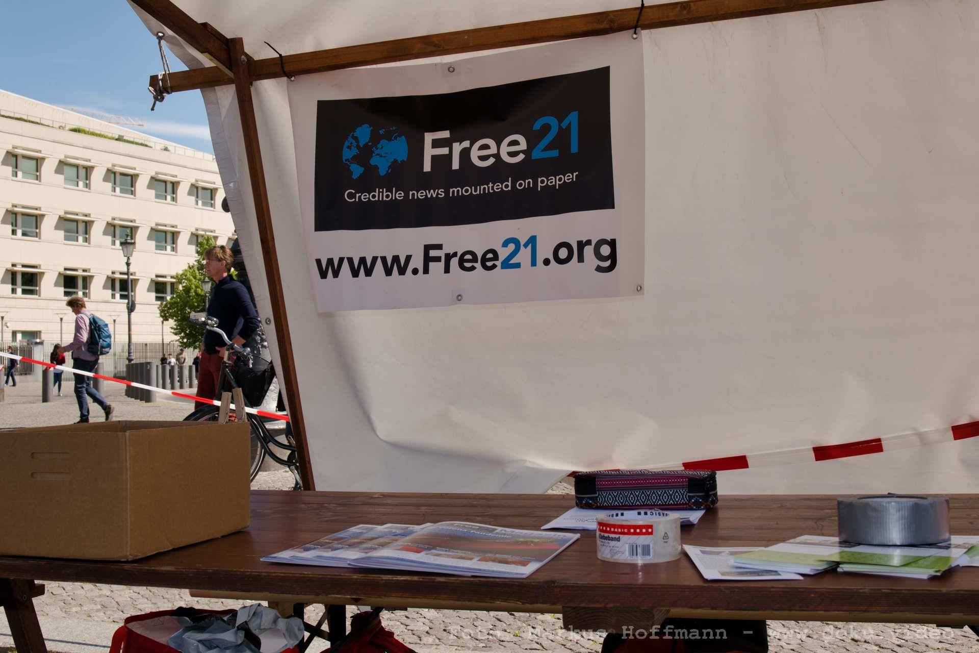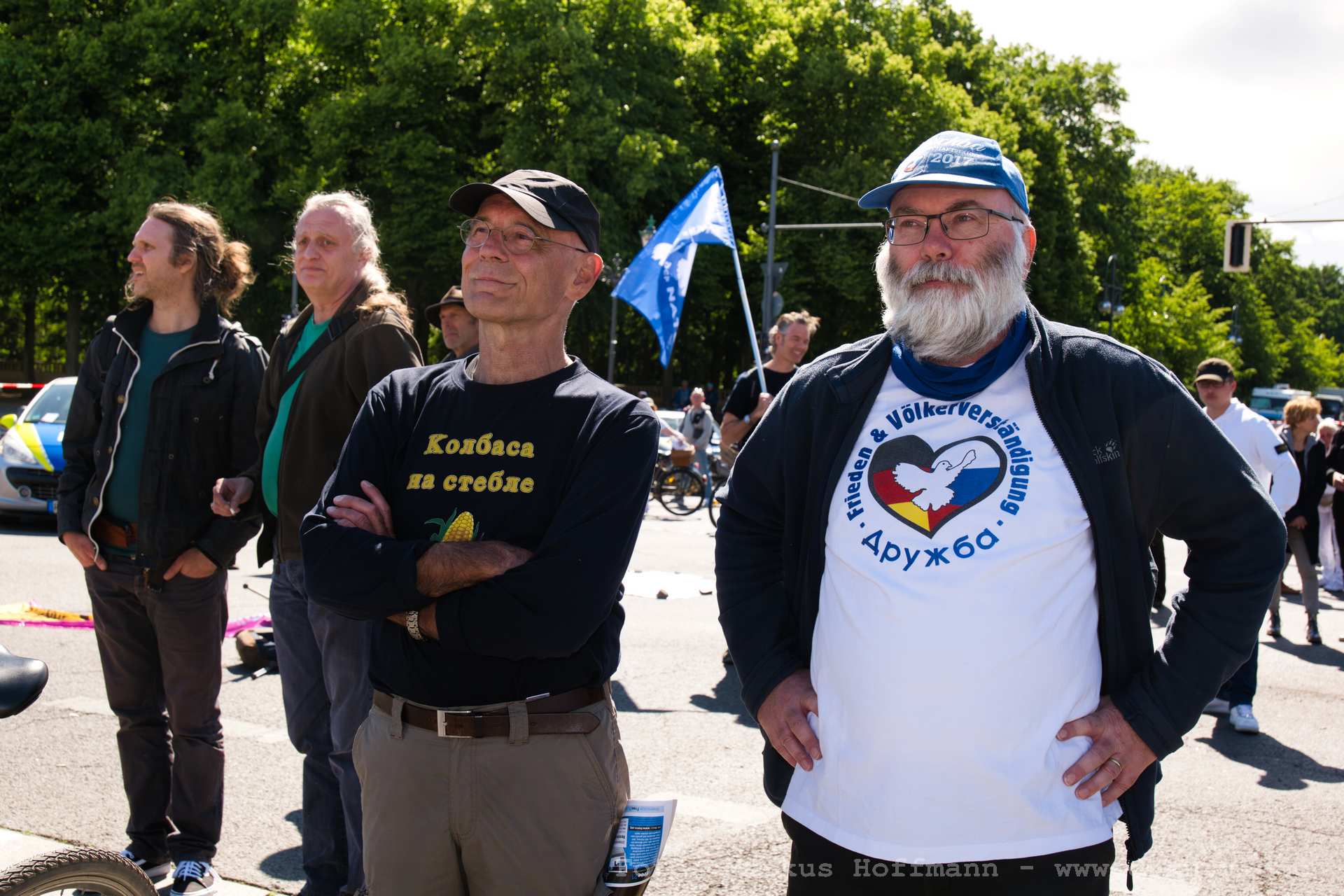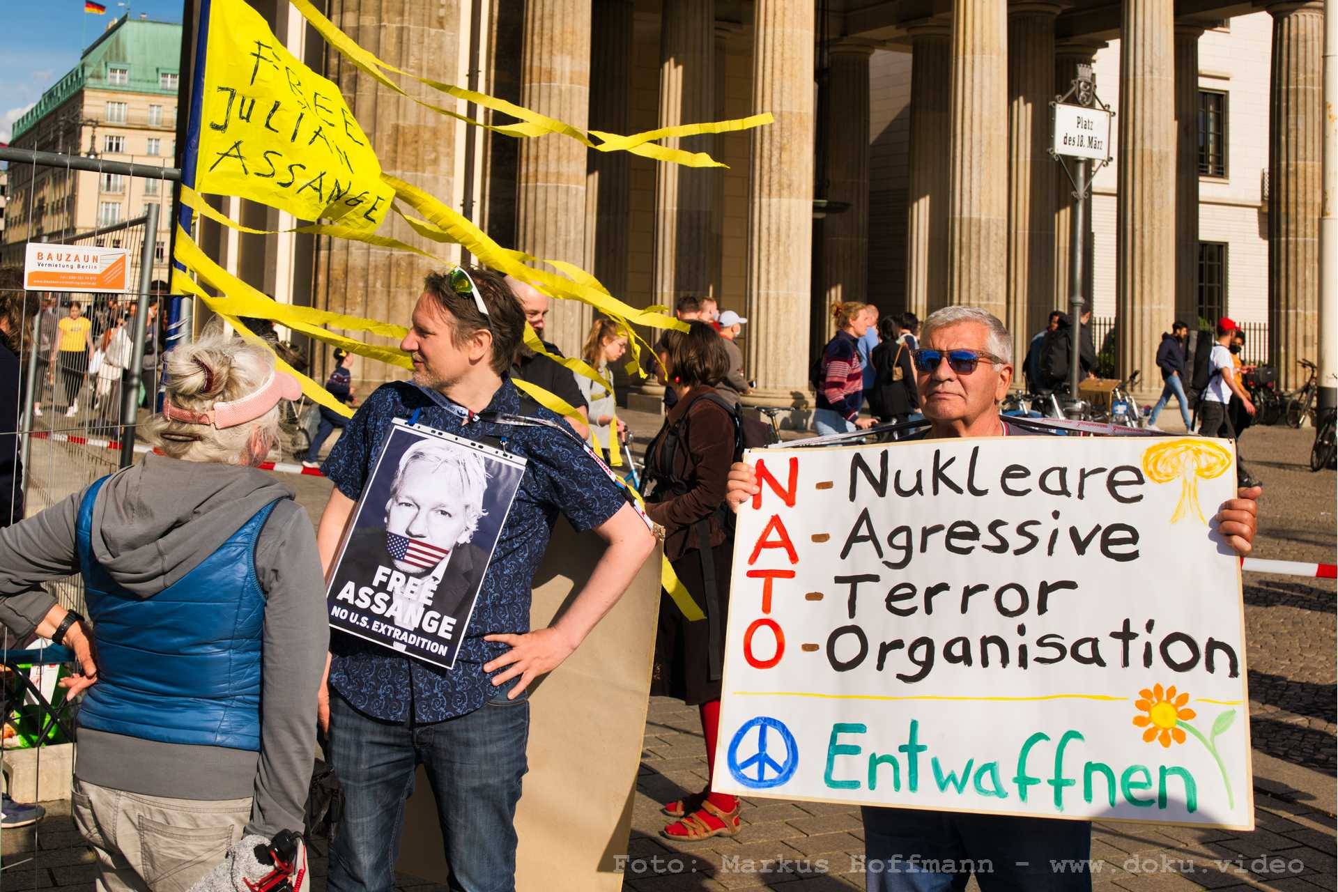 Einige Friedensfreunde fanden sich am Brandenburger Tor zusammen. Kurz zuvor wurde von den Organisatoren erst erstritten, dass mehr als 50 Personen teilnehmen dürfen. Deswegen war die bundesweite Mobilisierung erschwert. Die Stimmung und die Redebeiträge waren dennoch auf hohem Niveau. Die Fotos sollen einen Eindruck der Versammlung weitergeben ohne Anspruch auf Vollständigkeit. Insbesondere vom Anfang gibt es keine Fotos. Wojna von "Die Bandbreite", der das musikalische Finale gestaltete, ist auch im Video "Das Friedensfest in Fürstenberg und die Zeitungen" zu sehen.