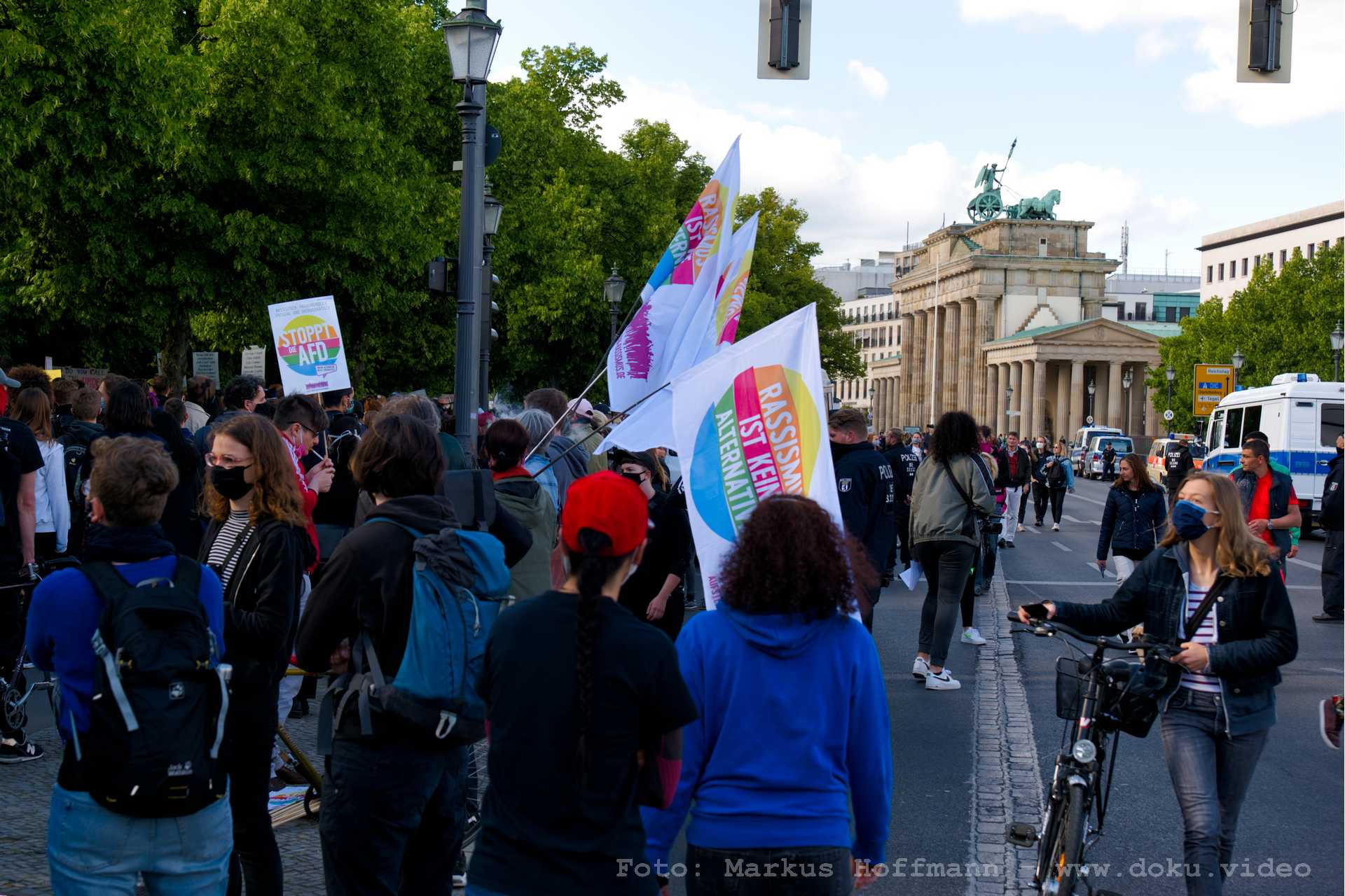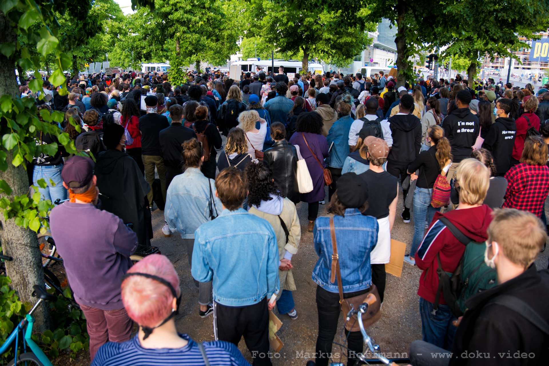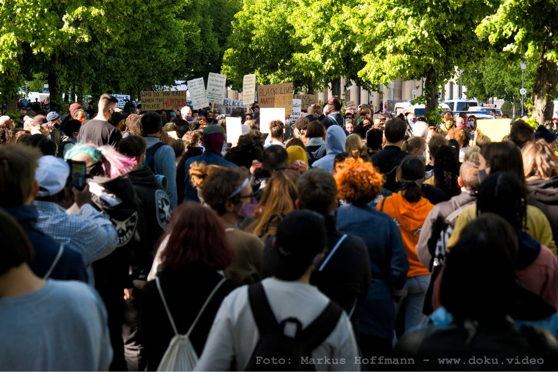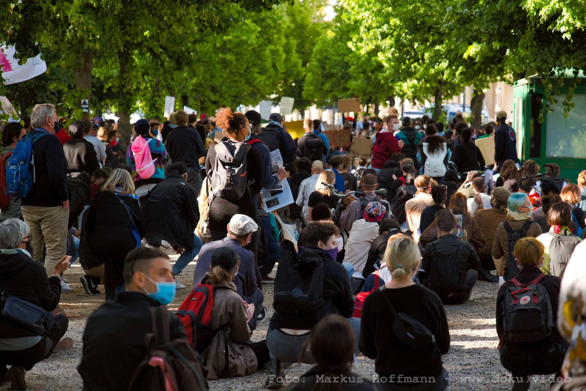 In der Nähe des Brandenburger Tores, im Berliner Tiergarten gegenüber der Botschaft der USA, fand parallel zu "Kündigt Ramstein" eine Demonstration unter dem Motto "Black Lives Matter" statt. Auch wenn die Rednerinnen und Redner dort auf ebenem Boden sprachen, war die Zahl der Teilnehmenden recht hoch.